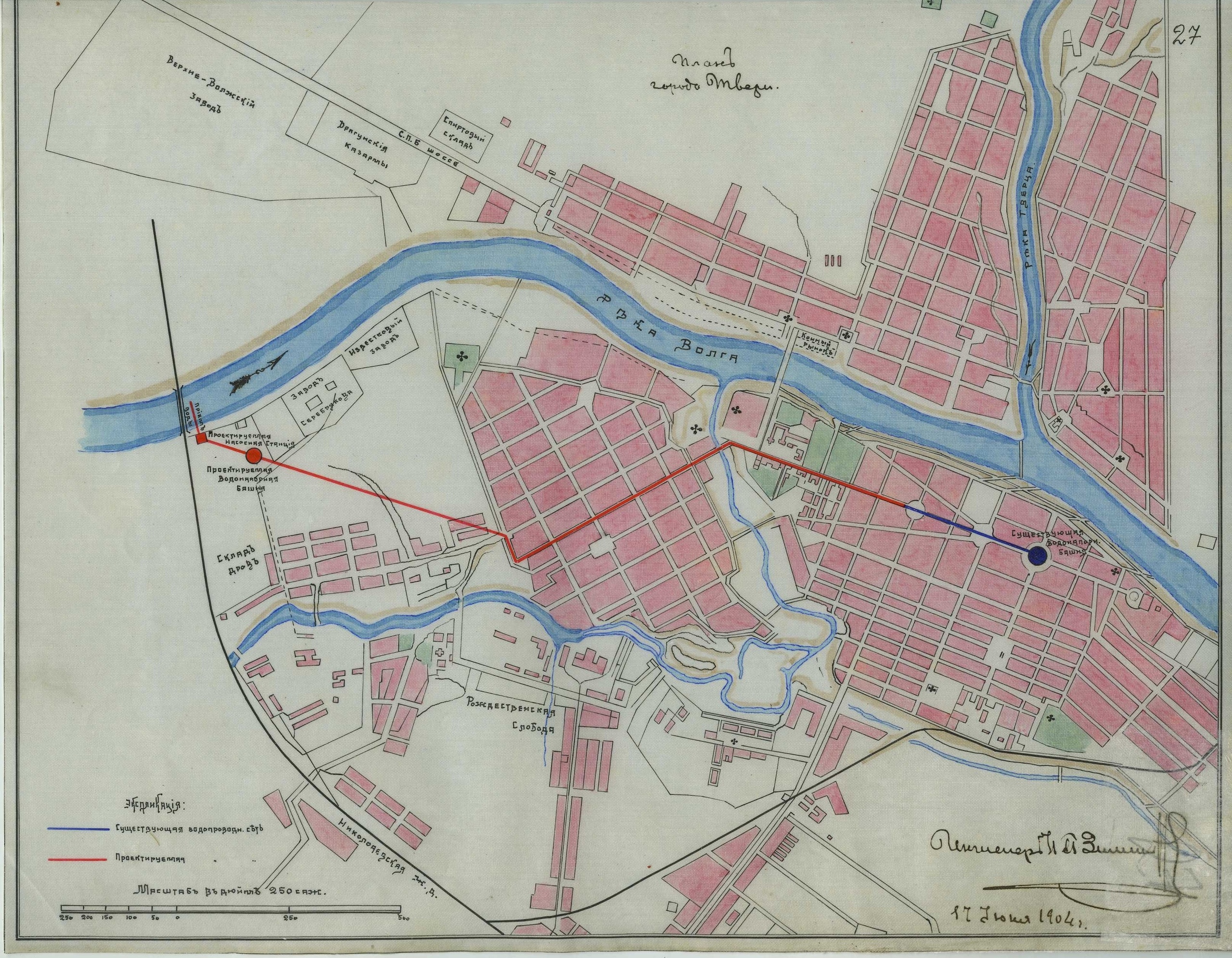 ГАТО. Ф. 850. Оп. 1. Д. 1445. Л. 27. План города Твери со схемой существующего и проектируемого водопровода. 17 июня 1904 г Централизованный водопровод в городе Твери появился еще в 1865 году при губернаторе П.Р. Багратионе. Тогда водозабор был размещен в городской черте ниже впадения в Волгу рек Тьмаки и Тверцы, а на перекрестке Татарского переулка и Миллионной улицы (ныне ул. Советская) была возведена четырехэтажная водонапорная станция.