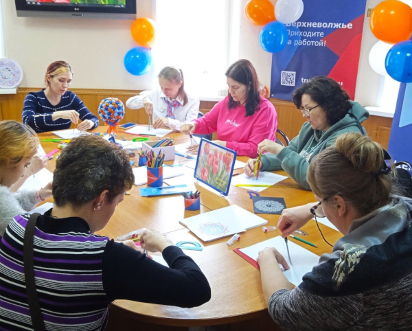 Под классическую музыку женщины вместе с сотрудниками Бологовского филиала изучили составление геометрического узора (мандалы).