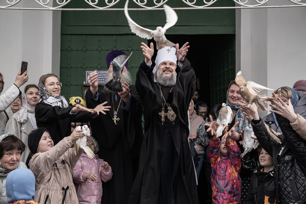 После богослужения митрополит, а вместе с ним духовенство и дети по традиции праздника Благовещения выпускали в небо голубей. Эти птицы являются символом Святого Духа, который изображается в Священном Писании в виде голубя.